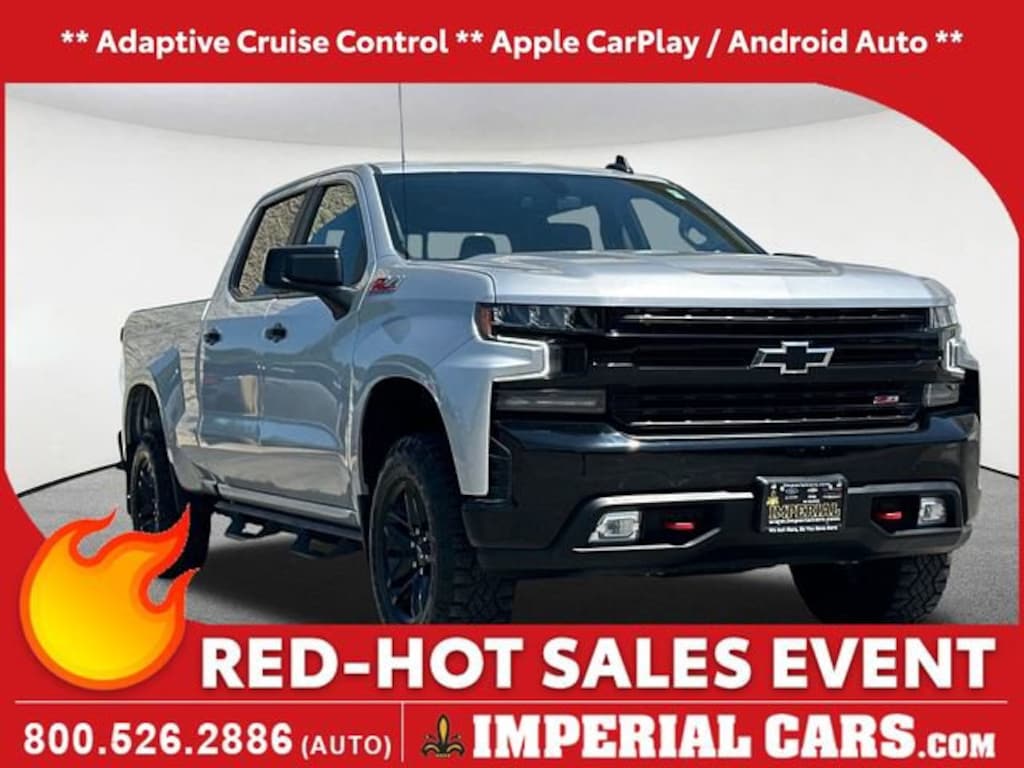 Adaptive Cruise Control, Apple CarPlay / Android Auto, Heated Seats, Backup Camera, Bluetooth, Cruise Control, Power Windows, Power Locks, Steering Wheels Radio Controls, Aluminum Wheels, 10-Speed Automatic, 4WD, Black Cloth, 10-Way Power Driver Seat w/Lumbar, 12-Volt Rear Auxiliary Power Outlet, 120-Volt Bed Mounted Power Outlet, 120-Volt Instrument Panel Power Outlet, 170 Amp Alternator, 2 USB Ports, 2 USB Ports (First Row), 4.2 Diagonal Color Display Driver Info Center, 4G LTE Wi-Fi Hot Spot Capable, 6-Speaker Audio System, All-Weather Floor Liner (LPO) (AAK), Auto-Locking Rear Differential, Auxiliary External Transmission Oil Cooler, Bluetooth® For Phone, Chevrolet Connected Access Capable, Cloth Rear Seat w/Storage Package, Color-Keyed Carpeting Floor Covering, Compass, Convenience Package II, Convenience Package w/Buckets Seats, Deep-Tinted Glass, Dual Exhaust w/Polished Outlets, Dual-Zone Automatic Climate Control, Electric Rear-Window Defogger, Electrical Lock Control Steering Column, Electronic Cruise Control, EZ Lift Power Lock & Release Tailgate, Floor Mounted Center Console, Front LED Fog Lamps, HD Radio, HD Rear Vision Camera, Heated Driver & Front Outboard Passenger Seats, Heated Steering Wheel, Heavy-Duty Air Filter, High Gloss Black Grille, High Gloss Black Mirror Caps, Hill Descent Control, Hitch Guidance, Keyless Open & Start, Leather Wrapped Steering Wheel, LED Cargo Area Lighting, LED Reflector Headlamps, Manual Tilt/Telescoping Steering Column, OnStar & Chevrolet Connected Services Capable, Performance Red Recovery Hooks, Power Door Locks, Power Front Windows w/Driver Express Up/Down, Power Front Windows w/Passenger Express Down, Power Rear Windows w/Express Down, Power Sliding Rear Window w/Rear Defogger, Preferred Equipment Group 2LT, Premium Bose 7-Speaker Sound System, Radio: Chevrolet Infotainment 3 Plus System, Rear Dual USB Charging-Only Ports, Rear Vision Camera, Remote Vehicle Starter System, SiriusXM Radio, SiriusXM w/360L, Standard Tailgate, Steering Wheel Audio Controls, Suspension Package, Theft Deterrent System (Unauthorized Entry), Trailering Package, Universal Home Remote, Wireless Phone Projection. Silver Ice Metallic 2021 Chevrolet Silverado 1500 LT Trail Boss 4D Crew Cab LT Trail Boss 4WD 10-Speed Automatic
