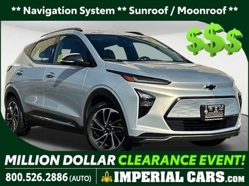 Navigation System, Sunroof / Moonroof, Blind Spot Monitor, Lane Keeping Assistance, Adaptive Cruise Control, Cross Traffic Alert, Apple CarPlay / Android Auto, Power Leather Seats, Heated Seats, Backup Camera, Bluetooth, Cruise Control, Power Windows, Power Locks, Steering Wheels Radio Controls, Aluminum Wheels, Luggage Rack, Bose Premium 7-Speaker Audio System, Power Dual Panel Panoramic Sunroof w/Slide, Preferred Equipment Group 2LZ, Radio: Chevrolet Infotainment 3 Plus System w/Navi, Sun & Sound Package. Silver Flare Metallic 2022 Chevrolet Bolt EUV Premier 4D Sport Utility Premier FWD 1-Speed AutomaticClean CARFAX. Electric Motor 125/104 City/Highway MPG Odometer is 5690 miles below market average!MORE ABOUT US: Imperial Cars Purchase With Confidence: 1) Free Car Fax Vehicle History Report available for all our vehicles online. 2) Our vehicles are Imperial Certified and go through a rigorous Multi-Point vehicle inspection. 3) Bottom line pricing. 4) 5-Day or 200 Mile Vehicle Exchange Program for your total confidence. If you are not happy with it bring it back within 7 days or 200 miles and we'll give you a credit of your full purchase price toward the purchase of another vehicle. (Excludes Renewed for You vehicles.)Please be aware that the price listed for the vehicle does not include tax, title, registration, documentation fee, or any other applicable fees. However, it does include a trade-in assistance bonus of $1,000 for qualifying retailable trades with less than 10 years of use from the original in-service date. To be eligible for the advertised promotional price, you must pay in full and take delivery of the vehicle from dealer stock on the same day. For the most up-to-date information and Imperial discounts, please call or email our phone and internet team. Please note that the price cannot be combined with any other discounts or promotions and is subject to change based on the market value at any time without notice. To receive the internet special discount, please mention the promo code INTERNET1. While we strive to provide reliable information, please note that the dealer is not responsible for any misprints involving the price and/or description of any vehicle offered for sale. It is your sole responsibility to inspect and verify such information before making a purchase. We want to be transparent in our dealings, and to that end, you can call 800-526-AUTO (2886) to receive your personalized Buy-For-Price. Lastly, please note that we do not sell to wholesalers or dealers, and some of our pre-owned vehicles may be subject to unrepaired safety recalls. To check if any vehicle has unrepaired recalls, you can look up the vehicle's VIN at https://www.nhtsa.gov/recalls.