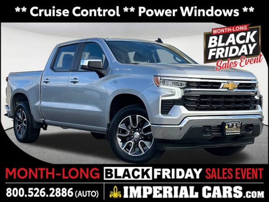 Recent Arrival! Cruise Control, Power Windows, Power Locks, Steering Wheels Radio Controls, Aluminum Wheels, 8-Speed Automatic, 4WD, Black Cloth. Silver Ice Metallic 2022 Chevrolet Silverado 1500 LT 4D Crew Cab LT 4WD 8-Speed Automatic2.7L TurboMORE ABOUT US: Imperial Cars Purchase With Confidence: 1) Free Car Fax Vehicle History Report available for all our vehicles online. 2) Our vehicles are Imperial Certified and go through a rigorous Multi-Point vehicle inspection. 3) Bottom line pricing. 4) 5-Day or 200 Mile Vehicle Exchange Program for your total confidence. If you are not happy with it bring it back within 7 days or 200 miles and we'll give you a credit of your full purchase price toward the purchase of another vehicle. (Excludes Renewed for You vehicles.)Please be aware that the price listed for the vehicle does not include tax, title, registration, documentation fee, or any other applicable fees. However, it does include a trade-in assistance bonus of $1,000 for qualifying retailable trades with less than 10 years of use from the original in-service date. To be eligible for the advertised promotional price, you must pay in full and take delivery of the vehicle from dealer stock on the same day. For the most up-to-date information and Imperial discounts, please call or email our phone and internet team. Please note that the price cannot be combined with any other discounts or promotions and is subject to change based on the market value at any time without notice. To receive the internet special discount, please mention the promo code INTERNET1. While we strive to provide reliable information, please note that the dealer is not responsible for any misprints involving the price and/or description of any vehicle offered for sale. It is your sole responsibility to inspect and verify such information before making a purchase. We want to be transparent in our dealings, and to that end, you can call 800-526-AUTO (2886) to receive your personalized Buy-For-Price. Lastly, please note that we do not sell to wholesalers or dealers, and some of our pre-owned vehicles may be subject to unrepaired safety recalls. To check if any vehicle has unrepaired recalls, you can look up the vehicle's VIN at https://www.nhtsa.gov/recalls.