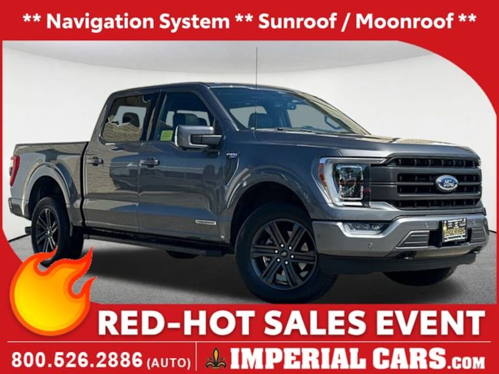 Navigation System, Sunroof / Moonroof, Blind Spot Monitor, Apple CarPlay / Android Auto, Lane Keeping Assistance, Adaptive Cruise Control, Cross Traffic Alert, Power Leather Seats, Heated Seats, Backup Camera, Bluetooth, Remote Engine Starter, Cruise Control, Power Windows, Power Locks, Steering Wheels Radio Controls, Aluminum Wheels, Running Boards / Side Steps, Towing Package, 3.5L PowerBoost Full-Hybrid V6, 4WD, 2nd Row Heated Seats, 6" Bright Polished Running Board, Accent-Color Angular Step Bars, Body-Color Front & Rear Bumpers, Box Side Decals, Chrome 2-Bar Grille w/4 Minor Bars, Chrome Door & Tailgate Handles w/Body-Color Bezel, Chrome Single-Tip Exhaust, Chrome Skull Caps on Exterior Mirrors, Dark 2-Bar & 1 Minor Bar Style Grille, Equipment Group 502A High, Heated Steering Wheel, Lariat Chrome Appearance Package, Lariat Sport Appearance Package, Leather-Trimmed Bucket Seats, LED Projector w/Dynamic Bending Headlamps, Onboard 400W Outlet, Power Glass Sideview Mirr w/Chrome Skull Caps, Power Tilt/Telescoping Steering Column w/Memory, Radio: B&O Sound System by Bang & Olufsen, Rain-Sensing Wipers, Universal Garage Door Opener, Wheels: 18" 6-Spoke Machined Aluminum, Wheels: 18" Chrome-Like PVD, Wireless Charging Pad. Carbonized Gray Metallic 2022 Ford F-150 Lariat 4D SuperCrew Lariat 4WD 10-Speed Automatic