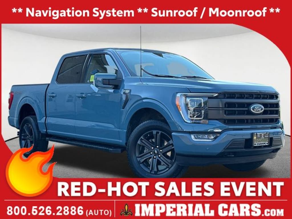 Navigation System, Sunroof / Moonroof, Blind Spot Monitor, Collision Avoidance Assistance, Apple CarPlay / Android Auto, Lane Keeping Assistance, Adaptive Cruise Control, Cross Traffic Alert, Parking Assistance, Power Leather Seats, Heated Seats, Backup Camera, Bluetooth, Remote Engine Starter, Cruise Control, Power Windows, Power Locks, Steering Wheels Radio Controls, Aluminum Wheels, Running Boards / Side Steps, Bed liner, Towing Package, 4WD, 2nd Row Heated Seats, ABS brakes, Accent-Color Angular Step Bars, Alloy wheels, Body-Color Front & Rear Bumpers, Box Side Decals, Chrome Single-Tip Exhaust, Class IV Trailer Hitch Receiver, Compass, Connected Built-In Navigation, Dark 2-Bar & 1 Minor Bar Style Grille, Electronic Stability Control, Equipment Group 502A High, Evasive Steering Assist, Extended Range 36 Gallon Fuel Tank, Ford Co-Pilot360 Assist 2.0, Front dual zone A/C, Heated door mirrors, Heated front seats, Illuminated entry, Integrated Trailer Brake Controller, Intelligent Adaptive Cruise Control w/Stop & Go, Intersection Assist, Lariat Sport Appearance Package, LED Projector w/Dynamic Bending Headlamps, Low tire pressure warning, Max Trailer Tow Package, Power Tilt/Telescoping Steering Column w/Memory, Pro Trailer Backup Assist & Pro Trailer Hitch Assist, Rain-Sensing Wipers, Remote keyless entry, Speed Sign Recognition, Traction control, Wheels: 20" Chrome-Like PVD, Wireless Charging Pad. Area 51 Blue 2023 Ford F-150 Lariat 4D SuperCrew Lariat 4WD 10-Speed Automatic