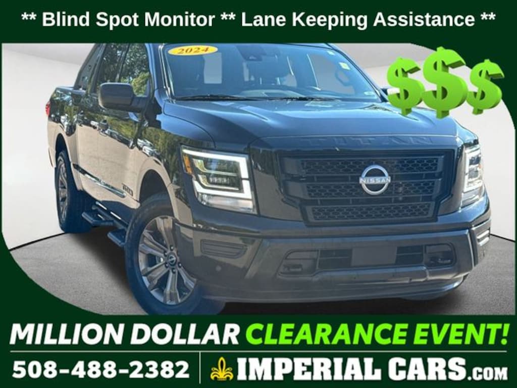 Blind Spot Monitor, Lane Keeping Assistance, Apple CarPlay / Android Auto, Adaptive Cruise Control, Cross Traffic Alert, Power Seats, Heated Seats, Backup Camera, Bluetooth, Cruise Control, Power Windows, Power Locks, Steering Wheel Radio Controls, Aluminum Wheels, Running Boards, 4WD, 120V/12V Outlets In Back Of Center Console, 2 Illuminated USB-A Ports In Back Of Center Console, Accessory Bronze Edition Floor Mats, Accessory Sport Bar, Accessory Utility Package, Auto-Dimming Rear-View Mirror, Black Center Console Cupholder Rings, Black Center I/P, Switch & Vent Finishers, Black Driver & Front Passenger I/P Finishers, Black Front Bumper, Black Headliner & A-Pillar, Black Utility Mirror, Bronze Center Console Finishers, Bronze Door Finishers, Bronze Steering Wheel Finishers, Bronze TITAN Emblem On Front Doors, Bumper Step, Dedicated Cell Phone Holder, Drop In Bed Liner, Dual Illuminated Vanity Mirror Front Sun Visors, Dual Zone Automatic HVAC, Front & Rear Parking Sensors, Front Door TITAN Emblem Delete, Full LED Headlamp, Gloss Black Front Grille Surround, Heated Front Captain's Chairs, Intelligent Key System, Leather-Wrapped Steering Wheel, Mood Light, NissanConnect Services, Overhead Console w/Sunglass Holder, Power Sliding Rear Window w/Defogger, Rear HVAC Vents, Remote Engine Start System, Special Liftgate Emblem Treatments, SV Bronze Edition Package, SV Convenience Package, Trailer Hitch, Wheels: 20" x 8.0JJ" Bronze, Wi-Fi Hotspot. Super Black 2024 Nissan Titan SV SV 4D Crew Cab 5.6L V8 DOHC 32V LEV3-ULEV70 400hp 4WD 9-Speed Automatic