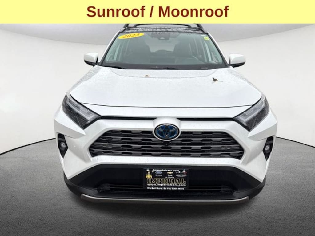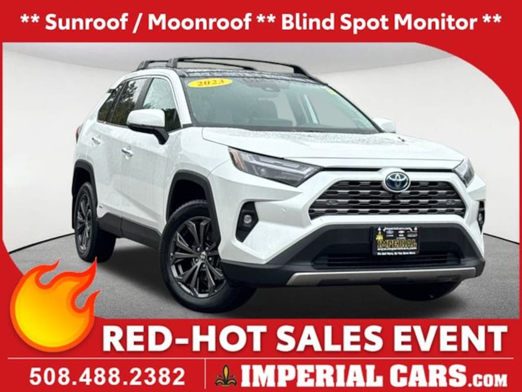 Sunroof / Moonroof, Blind Spot Monitor, Lane Keeping Assistance, Apple CarPlay / Android Auto, Collision Avoidance Assistance, Power Seats, Heated Seats, Backup Camera, Bluetooth, Cruise Control, Power Windows, Power Locks, Steering Wheel Radio Controls, Aluminum Wheels, Luggage Rack, 2.5L 4-Cylinder, Bird's Eye View Monitor, Front Seat Heating/Ventilation, Heated 3-Spoke Leather Steering Wheel, Limited Advanced Technology Package, Limited Grade Weather Package, Qi-Compatible Wireless Smartphone Charging, Rear Outboard Seat Heating, Smart Key System w/Push Button Start. White 2023 Toyota RAV4 Hybrid Limited Limited 4D Sport Utility 2.5L 4-Cylinder AWD eCVT