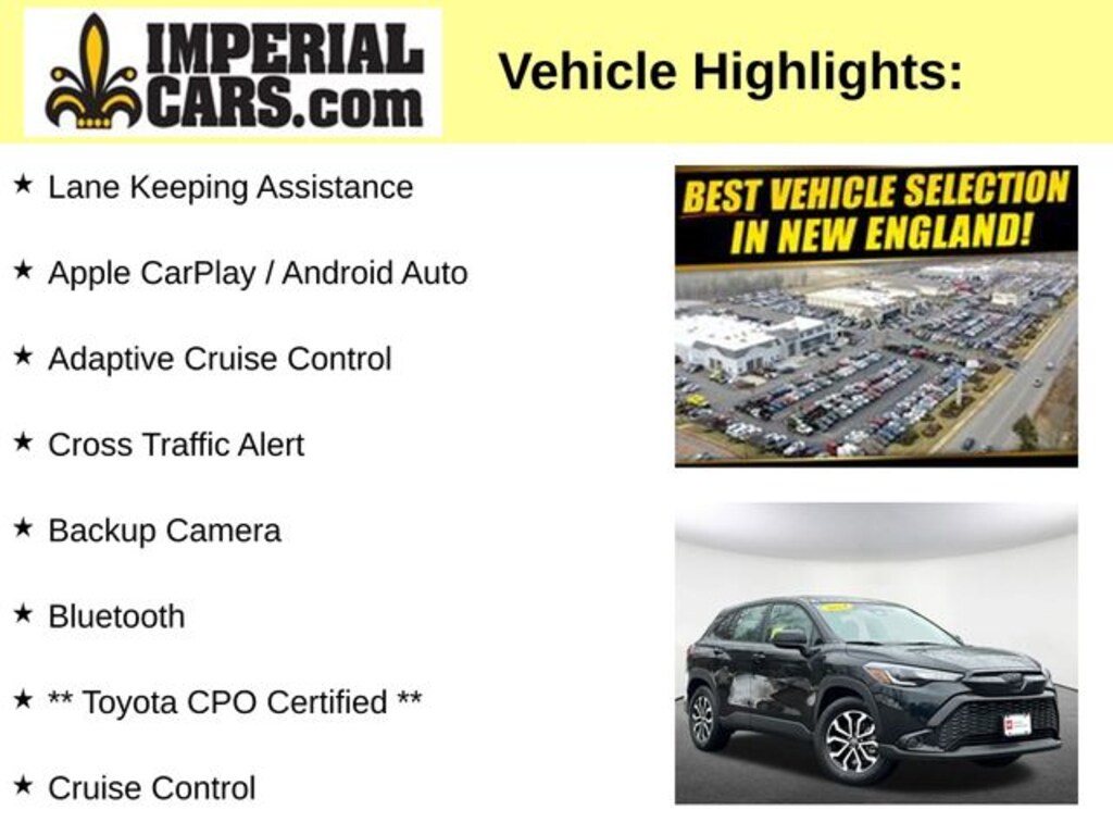 As a Toyota Certified Pre-Owned vehicle, this Corolla Cross Hybrid S has undergone a rigorous 160-Point Inspection and comes with a comprehensive warranty package, including a 12-Month/12,000-Mile Limited Comprehensive Warranty and an 84-Month/100,000-Mile Powertrain Limited Warranty. Additionally, you'll receive Roadside Assistance for 7 Years/100,000 Miles and the peace of mind that comes with a Transferable Warranty and a detailed Vehicle History.